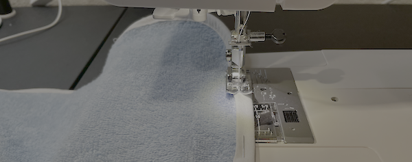 Once you’ve completed this base stitch, fold the bias back over and wrap it over to the opposite side of the towel, just like you did with the hood bias. Clip this down and stitch around.