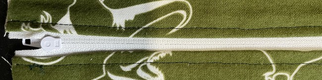 4. Using your zipper foot sew the top half of the zipper to the two fabric pieces. You can feel the lump of the zipper under the fabric and line up the foot toe along this edge as a guide when you see. The zipper lump will be on the left side of the zipper foot.