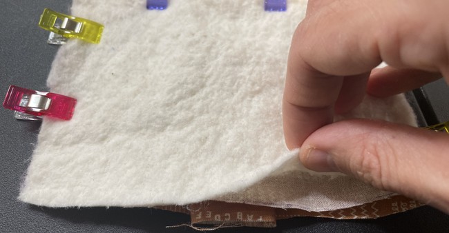 5. Lay the pieces for the main coffee sleeve together in this order: cotton fabric side one right side up, cotton fabric right side down, cotton batting on top.